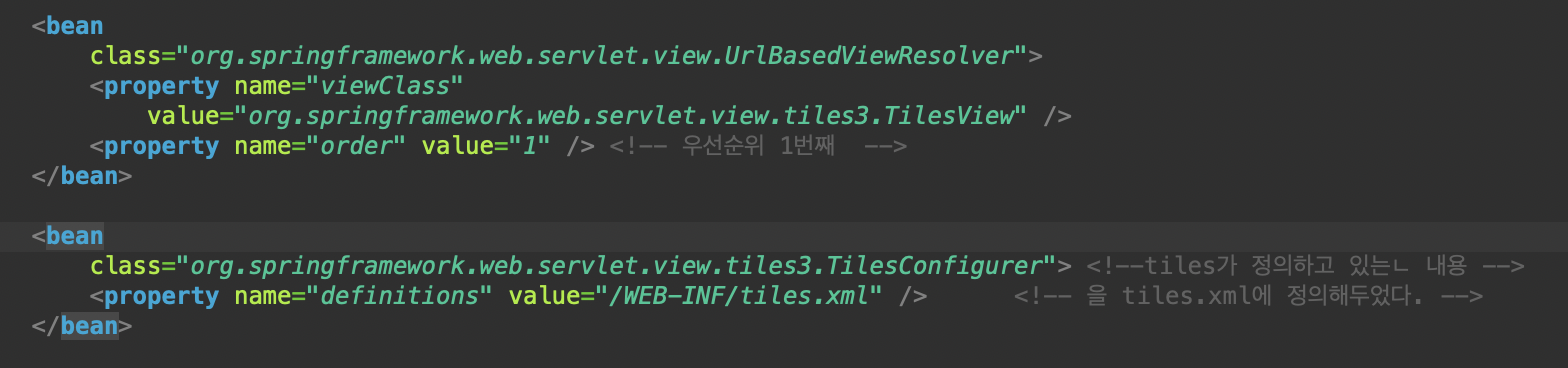 dispatcher-servlet.xml에서, Tiles와 관련된 ViewResolver를 설정해주어야 한다.
