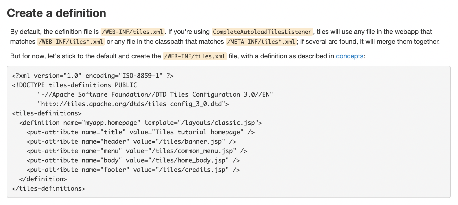 https://tiles.apache.org/framework/tutorial/basic/pages.html 에 접속해서