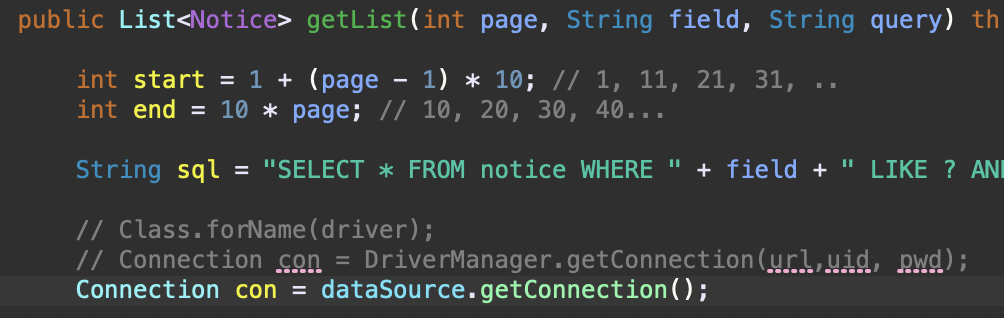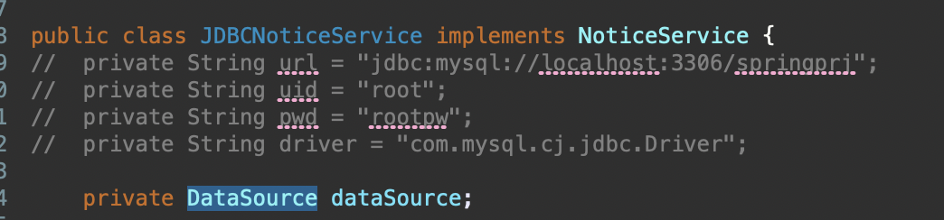 본래 서비스를 제공하는 곳에 있는 연결정보를 주석처리하고, DataSource 객체를 생성한다.