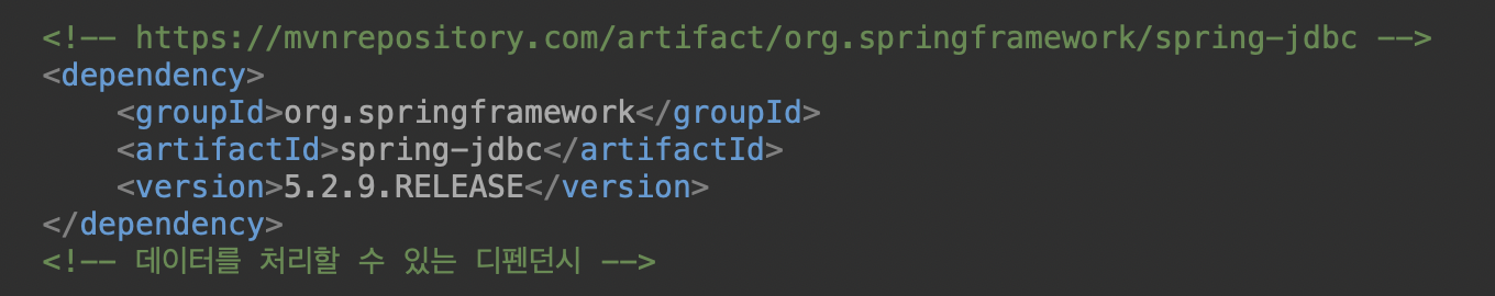 pom.xml 에서, 데이터 처리를 위한 spring-jdbc dependency를 추가한다.