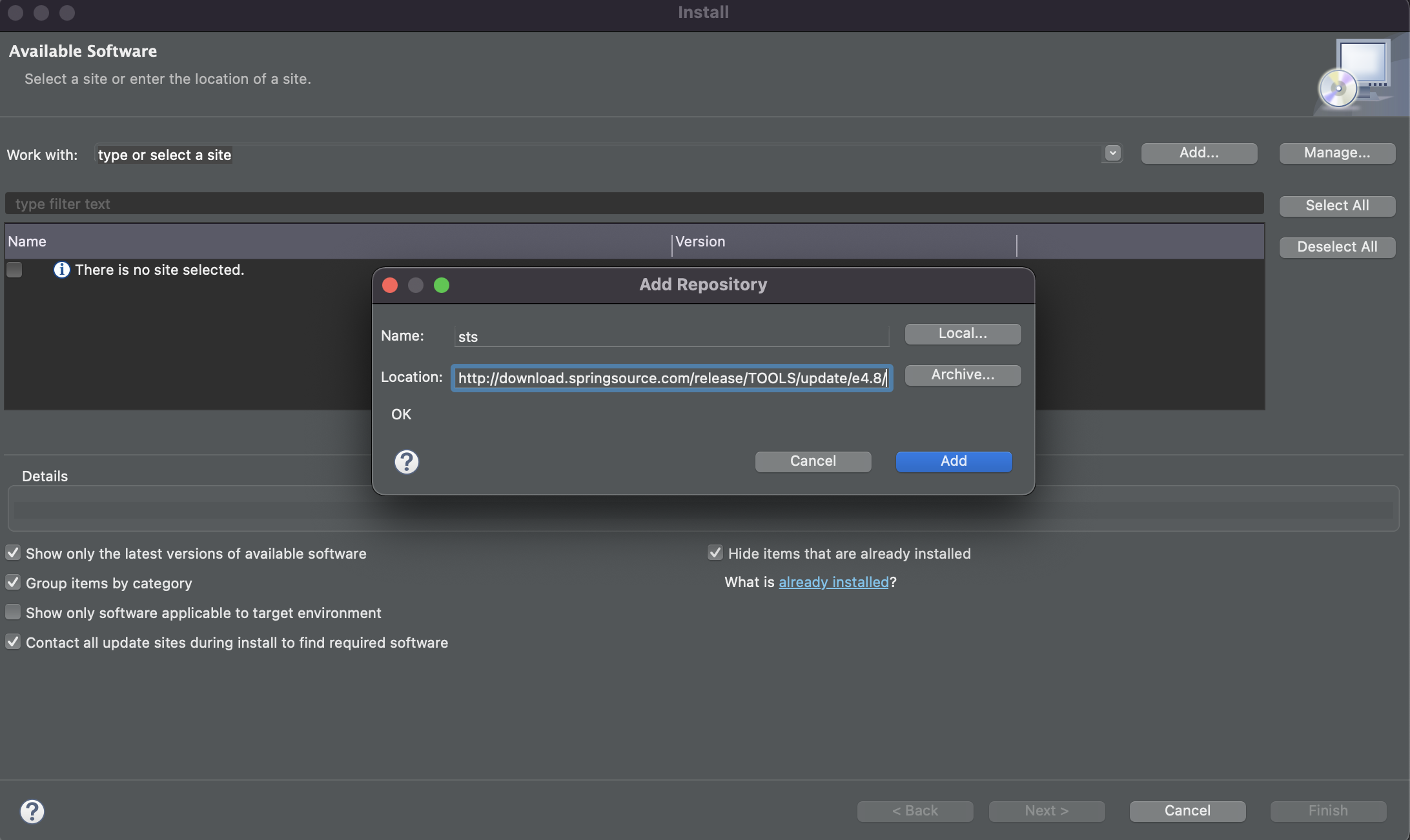 위 이미지처럼 마찬가지로 spring IDE 관련 요소들만 설치가 불가능한 상황이 옴. 실패