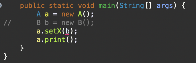 이후 a.setX(x) 를 통해 인터페이스를 세팅해주고, print() 메소드를 실행하면